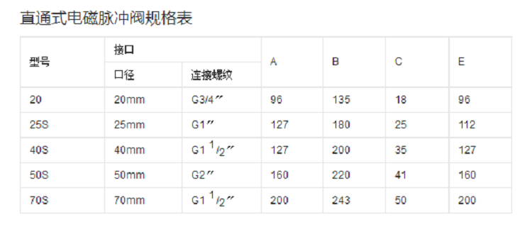 電磁脈沖閥的規(guī)格型號不同,它的具體參數(shù)也不一樣,下面是常用的型號參數(shù)表:
