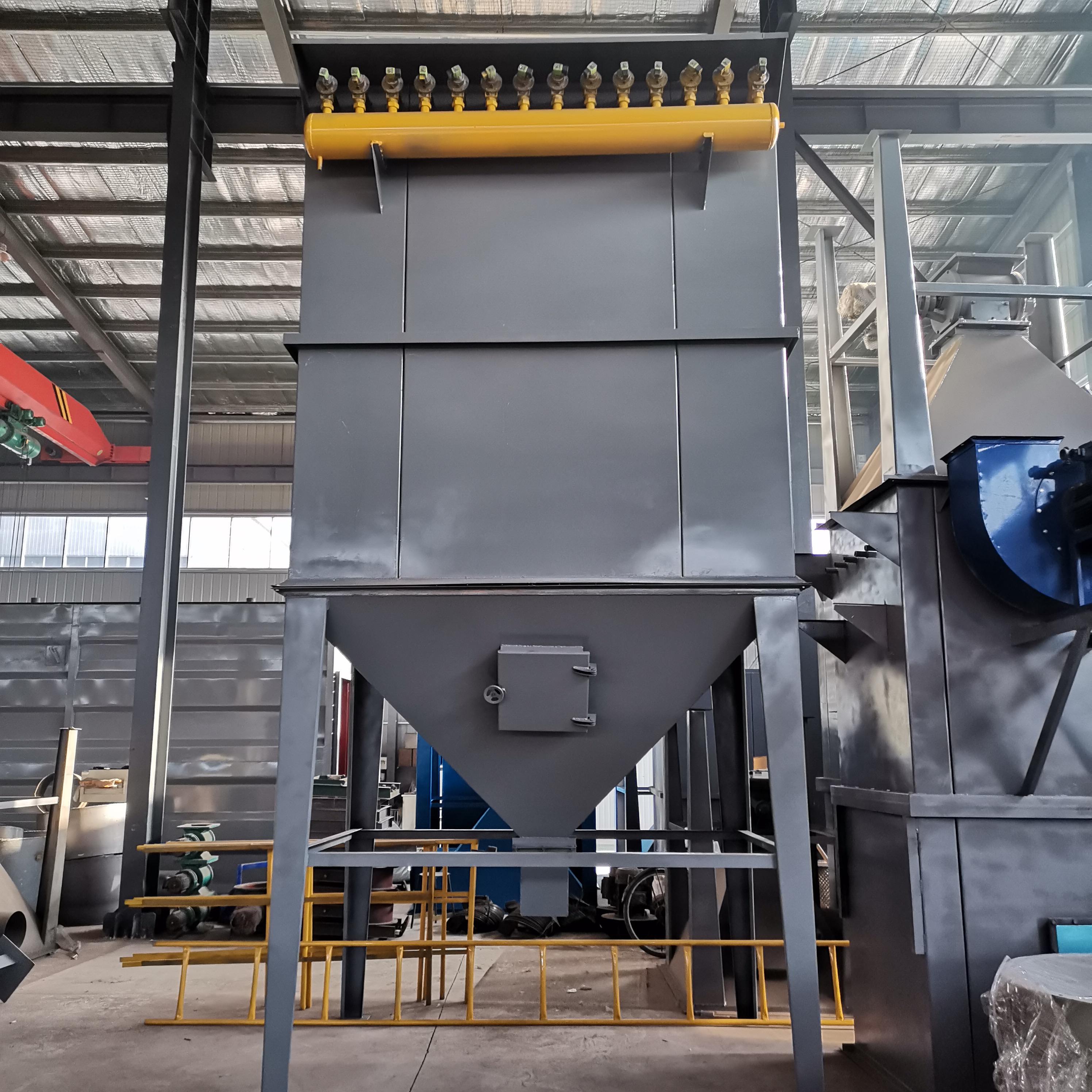 單機脈沖布袋除塵器是由上箱體,中箱體和下箱體組成,上箱體為凈化室,中箱體為過濾室,下箱體為灰斗,含塵的氣體由下箱體進入,通過中箱體內的過濾布袋對氣體進行有效過濾,凈化后的氣體進入上箱體的凈化室,通過引風機在煙筒排放。